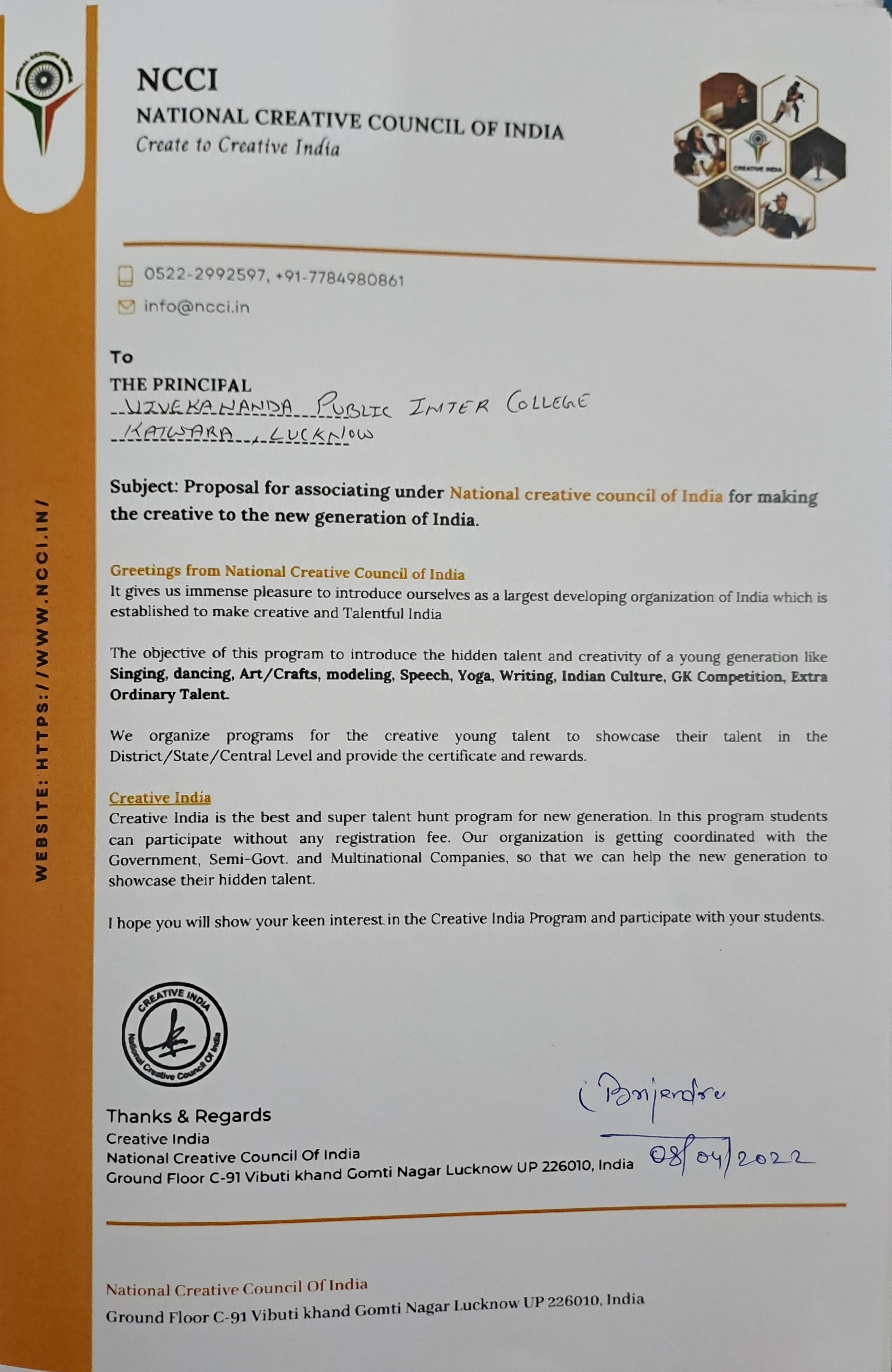 Association letter of Cosmoplitan Inter College